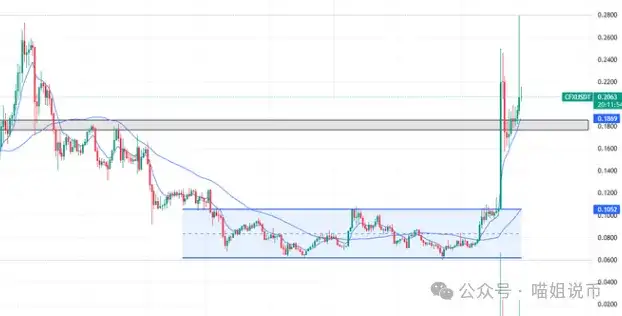 #CFX:强势突破长期横盘区间,站稳关键位后看涨预期增强。每次回踩都是买点,继续关注突破区域的支撑强度。