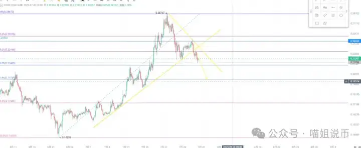 #DOGE:下破上升趋势线,123法则已完成,正处于波浪下行第八浪。趋势偏崆,支撑看0.215和0.198,压力在0.230和0.2455。