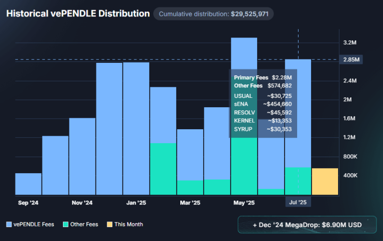 据官方页面,25 年 7 月的 vePENDLE 的费用达到 285 万美元,即使除去不确定性更大的空投部分,也达到 228 万美元。