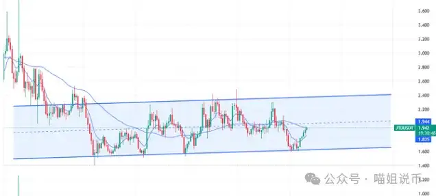 #JTO :目前稳坐日线上的上升通道,最近从下方支撑反弹后,价格逐步逼近中轨和50日均线这两个短期阻力点。只要它继续守住通道底部,整体看涨格局不变,短期内有望继续向上冲击2.4 附近。但要警惕,如果跌破下行趋势线,趋势可能会反转。