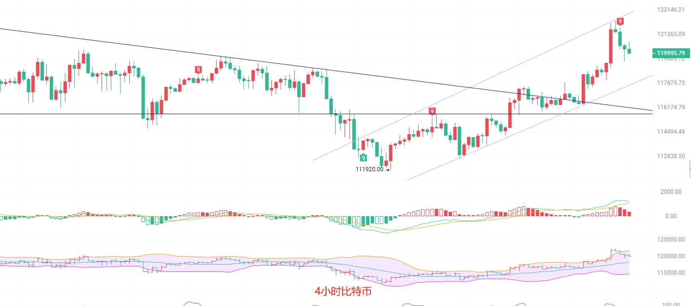 比特币现价12万,现在是北京时间凌晨一点,比特币再次来到了历史高点附近,12.2南下可以试仓,目前冲击布林带上轨121000回落,说明上方有明显阻力,主力在盘口出现了明显的拉高出货,想要再一次拉伸除非有重大利好出现,四小时快线高位出现神奇九转行情,一路四连阴向下跌破短线支撑12万,现在一直围绕12万横盘,MACD连续顶部背离放量减少,DIF和DEA开始收缩,短线行情开始回落,短期内回去以空为主,不建议追高,盘口行情明显乏力,追高风险大于收益