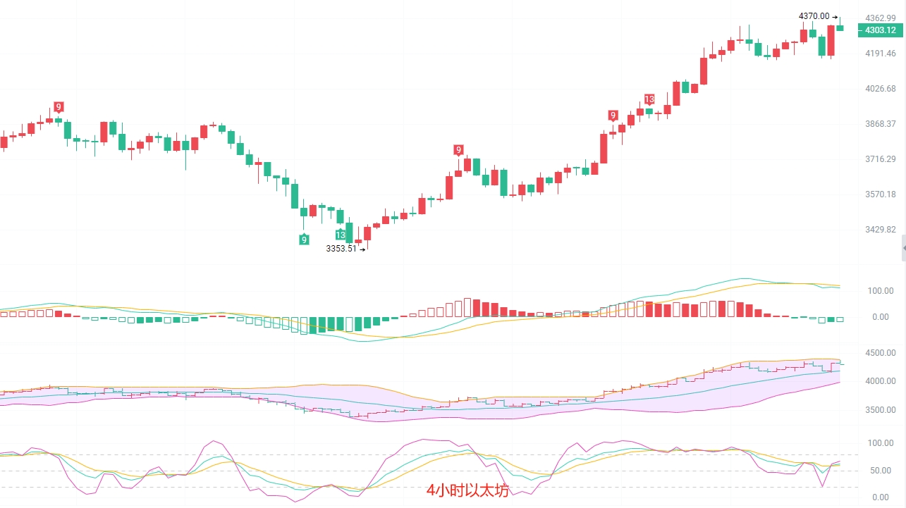 以太坊现价4330,现在是北京时间凌晨一点,盘口一直在拉伸,多头一直背离,主力资金显示流入积极,加上连续的拉伸破记录,发稿前以太坊最高已经抵达4400附近,距离历史高点4878也不远了,日线级别趋势指标多头不变,放量增筹明显,MACD上行强势阶段,布林带上轨4285压力位失守,多头延续,四小时K线一波回踩4160支撑又快速向上拉伸,多头占据主导地位,布林带高位收缩,上轨压力位来到了4400,主力破了4400以后喜欢短线的币友可以在高位布局短空,快进快出,下方支撑4160附近可以尝试短多,带好止损做好风控
