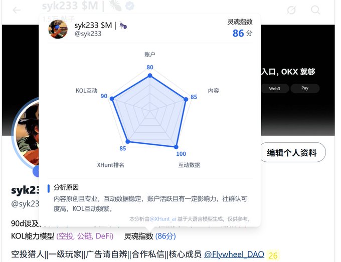 xhunt @xhunt_ai 最新更新的这个灵魂指数直接把KOL的底裤巴得一干二净!如图所示我只有86分,刚达到及格线