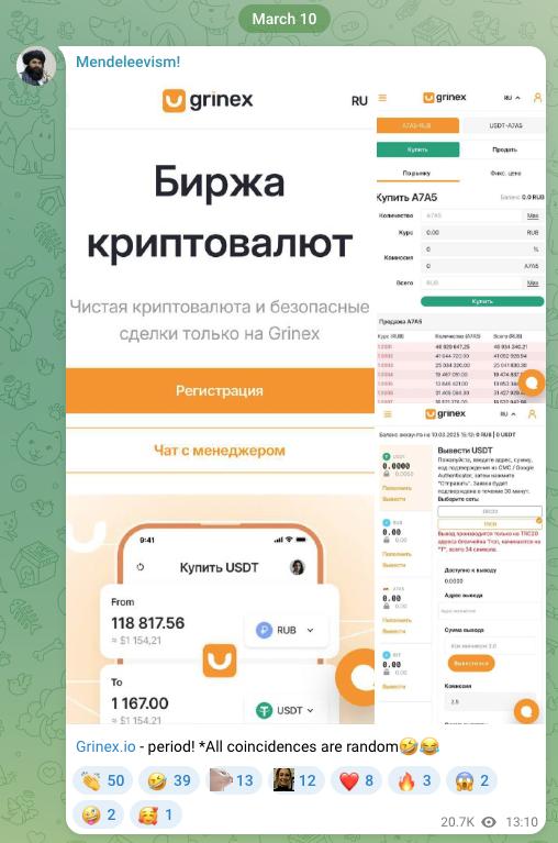 此外,Garantex创始人Sergey Mendeleev也在同一天被制裁,并在Garantex停止后立即在自己的社交媒体上宣传Grinex,并开玩笑说"所有巧合都是偶然的"。