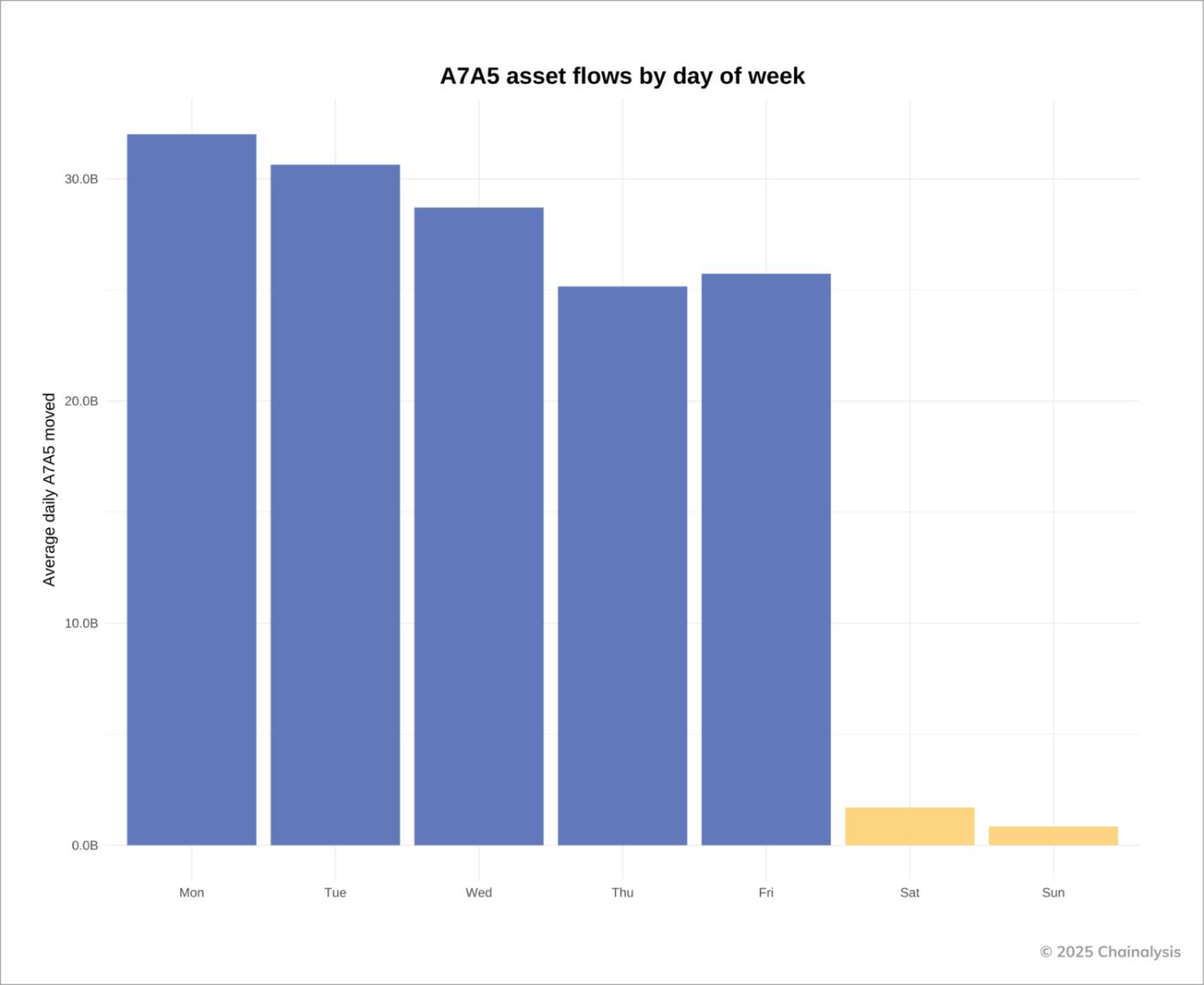 除了A7A5仅在有限服务中使用外,其每周交易模式也显示出在封闭生态系统中的有限使用。A7A5交易主要集中在周一至周五的工作日,交易量在周初达到最大,周末则非常少。