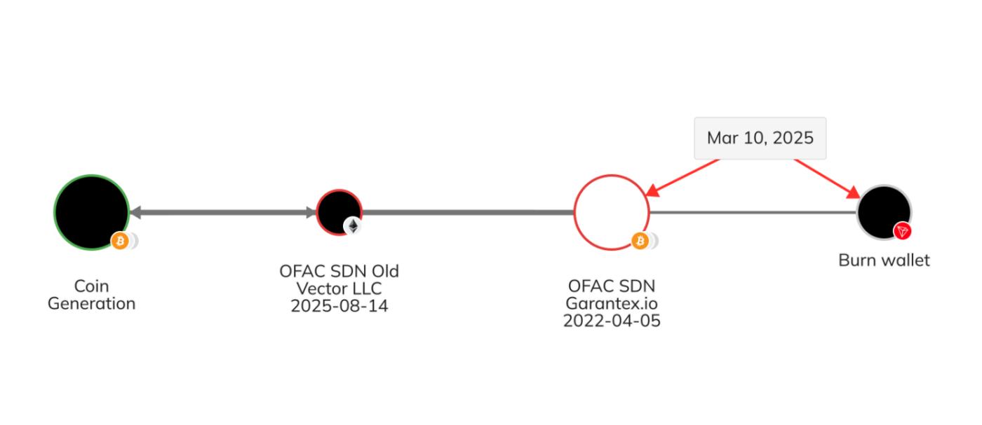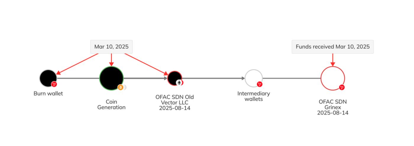 另一个链上关联是,Garantex停止后,通过Old Vector(受制裁的吉尔吉斯企业)从Garantex向Grinex转移了A7A5代币。Garantex自2月起已接收新发行的A7A5代币(A7A5合约于1月底创建),在3月6日停止后,大量A7A5代币从Old Vector发送到Garantex,并于3月10日被销毁。