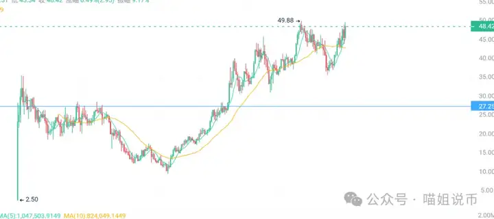 #HYPE:过去一周收涨20%,逼近50历史高位。7月回调后买家明显在等机会,反弹力度很猛。如果能把50变成支撑,后续有望冲54、60、66,走势会进入新一轮“价格发现”。