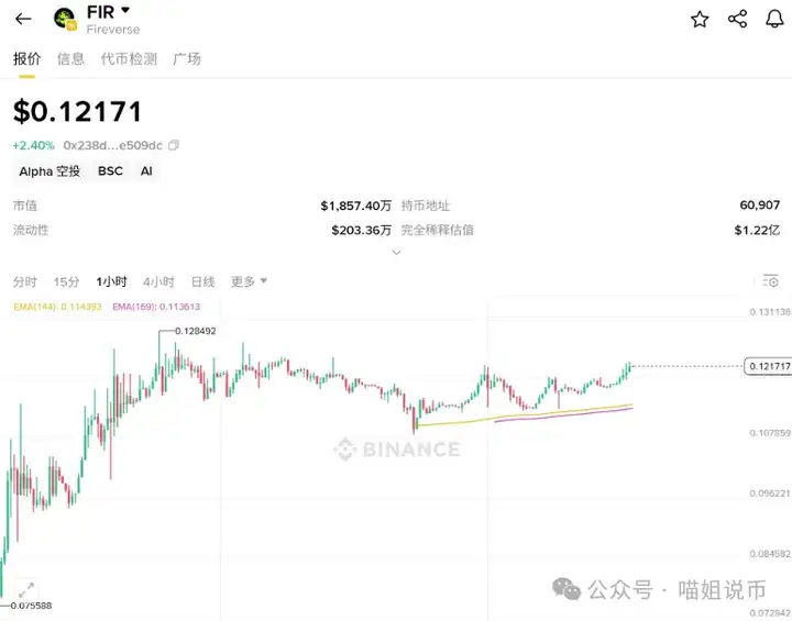 #FIR:刚上线BN ALPHA,由星爷电影IP背书,安琪等明星参与的音乐项目。近期在0.12附近横盘,主要在消化空投和早期筹码抛压,盘口买盘厚度不错。流通市值才1700万,技术面多头力量在积蓄,短期有望向上试探。