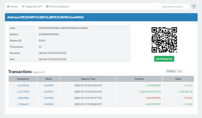 1⃣ 2025年3月17日:转入58,249 $DOGE并在同一时间转出58,249 $DOGE。