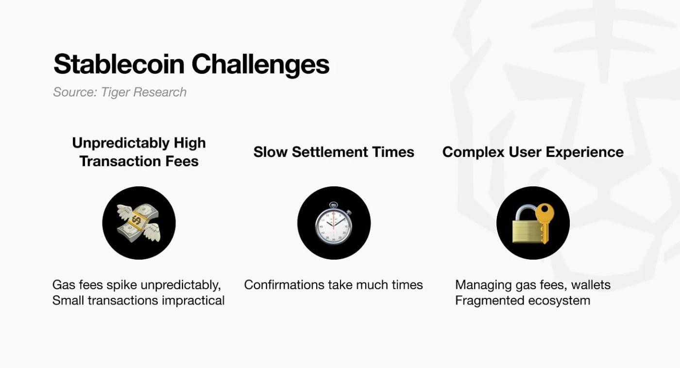 稳定币在多个区块链网络中运行,但当网络拥堵时,手续费会急剧上升,使得小额交易变得不切实际。在某些情况下,发送 10 美元可能会产生 20 美元的费用。这破坏了稳定币作为日常支付媒介的核心用途。