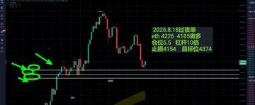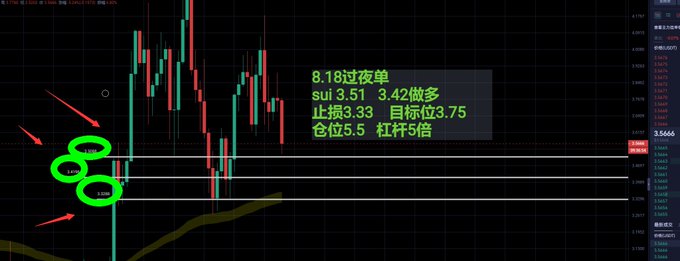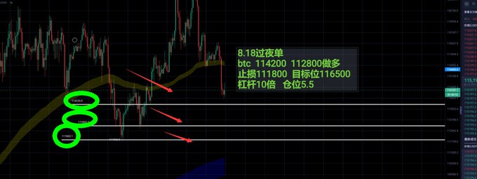 兄弟们,行情不稳我们就挂8.18号过夜单吧,明天起来收米吃肉 1:过夜单 btc 114200 112800做多 止损111800 目标位116500 杠杆10倍 仓位5.5 2: 过夜单 eth 4226 4185做多 仓位5.5 杠杆10倍 止损4154 目标位4374 3: 过夜单Sol 177.6 173.5 做多 止损170.5 目标位184 仓位5.5 杠杆10倍 4: 过夜单 sui 3.51 3.42做多 止损3.33 目标位3.75 仓位5.5 杠杆5倍
