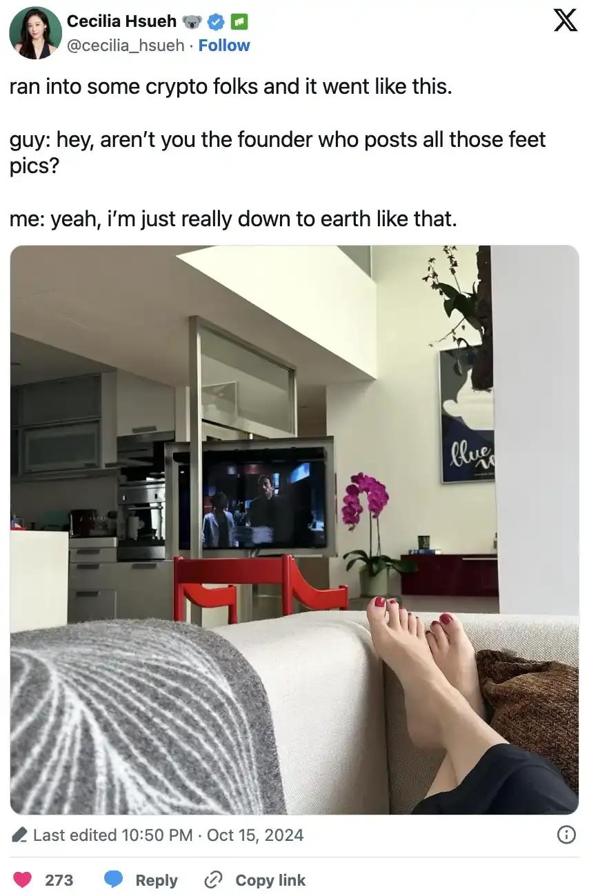 而有些抽象的是,在大部分加密社区的人心里,Cecilia 的形象始终模糊。但因为她一度在社交媒体上发布自己脚部的照片,反而让她的脚部留给了外界最深的记忆点。