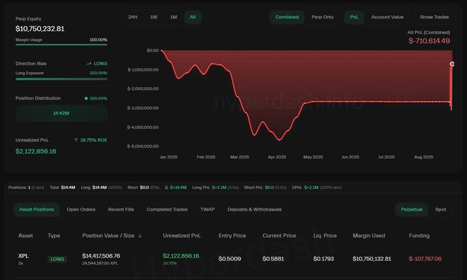 Yesterday, a whale opened an $XPL long position with 3x leverage and currently has a floating profit of ~$900K.