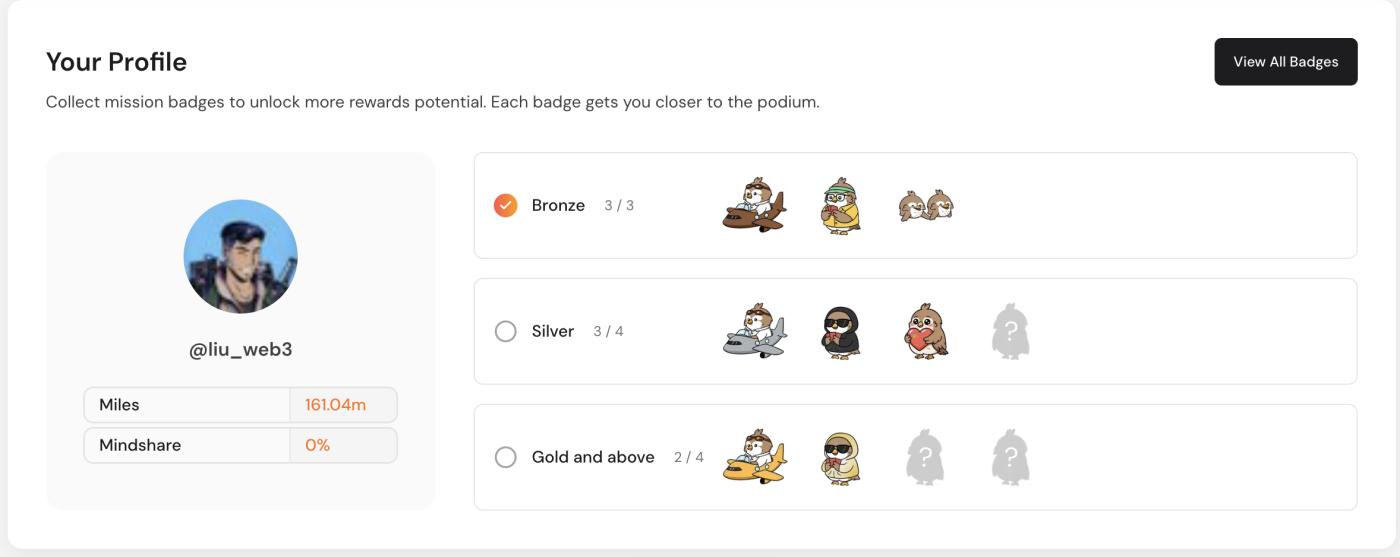 Yap2Fly 是 Falcon 与 Kaito 合作推出的活动,将综合计算用户的 Falcon Miles 和在社交媒体上发帖 Yap 获得的「Mindshare」产生排名。每月会将约 5 万美金的 USDf 奖励池分发给排名前 50 的用户,徽章系统除用于解锁奖励比例外,还可能会有额外奖励。
