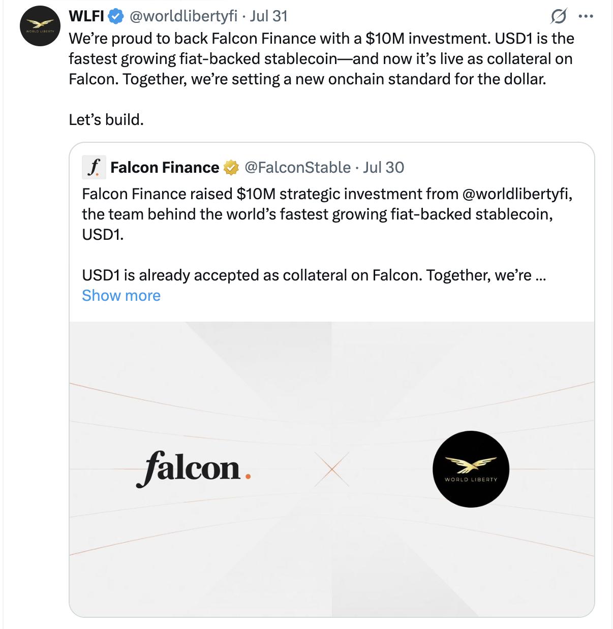 2025 年 7 月 30 日,Falcon Finance 宣布 WLFI 向其投资 1000 万美元。这是 WLFI 在稳定币领域的首笔投资,而 WLFI 拥有自己的美元稳定币 USD1(以美国国债和现金等实物资产为抵押)。双方表示融资将用于加速 Falcon 跨链兼容性、USDf 与 USD1 之间互操作性等技术集成。