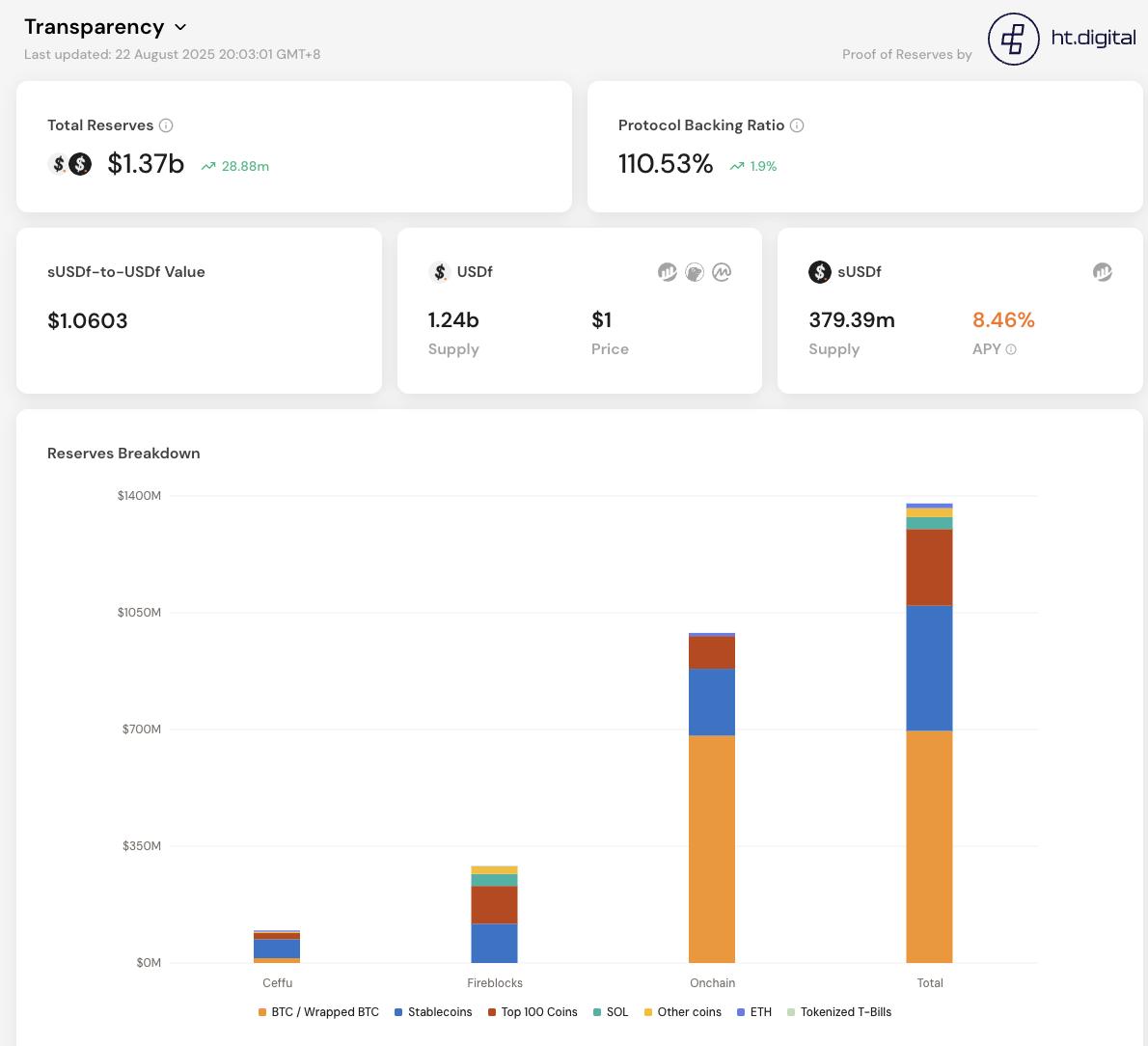 与多数稳定币不同,USDf 并非由单一资产担保,而是采用多资产超额抵押加上对冲策略:所有发行的 USDf 都需要有超过 1 美元价值的抵押品支撑,协议当前的抵押率在 110%~116% 之间。