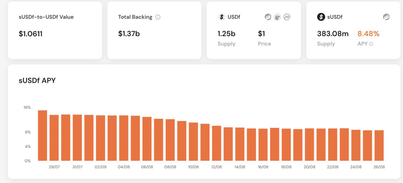 截止今天(8 月 26 日),USDf 的流通供应量为 12.5 亿美元,作为新兴协议位居所有稳定币发行量前 10。生息版本 sUSDf 供应量为 3.83 亿枚,提供 8.48% 的年化收益率。