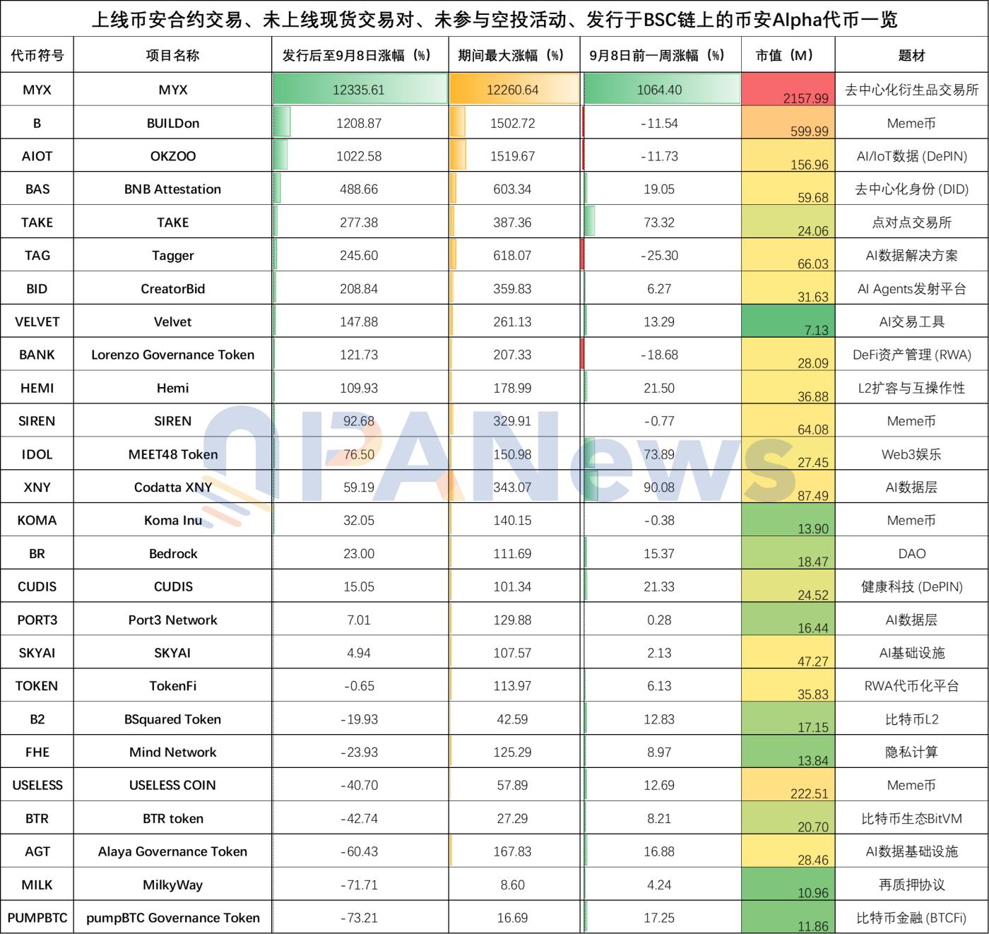 综合来看,符合这些特征的代币并非全部是上涨的状态,其中有8个代币在上线币安Alpha后还是跌破了上线价格。最大的跌幅甚至超过70%。另外,这些代币的整体的特点是普遍为有实际应用的项目代币,且分布当中与AI相关的代币占比较高。而此前市场中相对热闹的MEME币在这个榜单当中却显得稀缺,仅有4个,还基本都是早已成名或是有着明显背书的MEME代币。