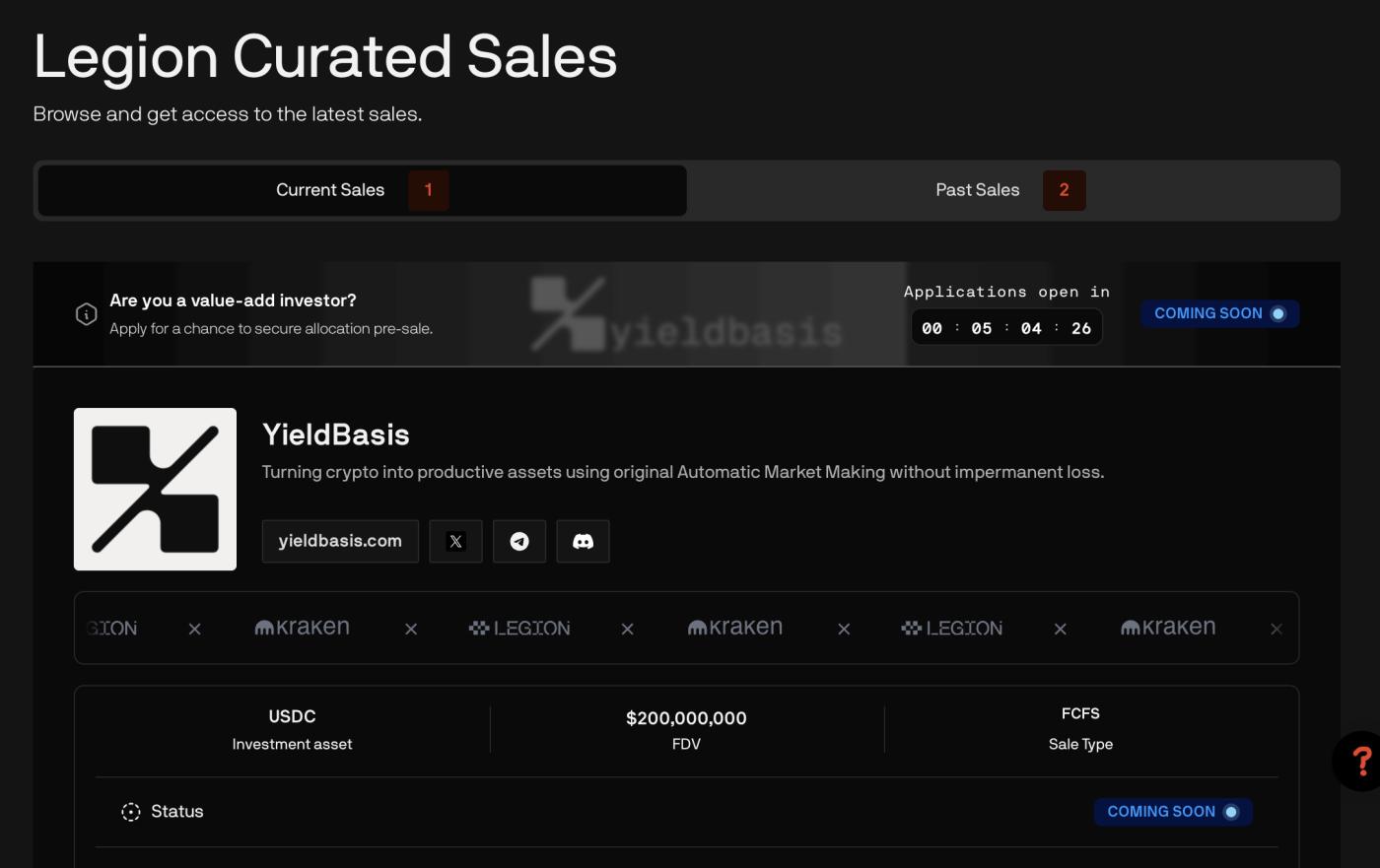 9月29日, Kraken和Legion Launchpad开启预售。目标融资额为500万美元,FDV为2亿美元,TGE解锁率为100%。作为首发项目,该项目结合了Legion Score(得分>350优先)和Kraken合规性。用户完成KYC后即可加入。