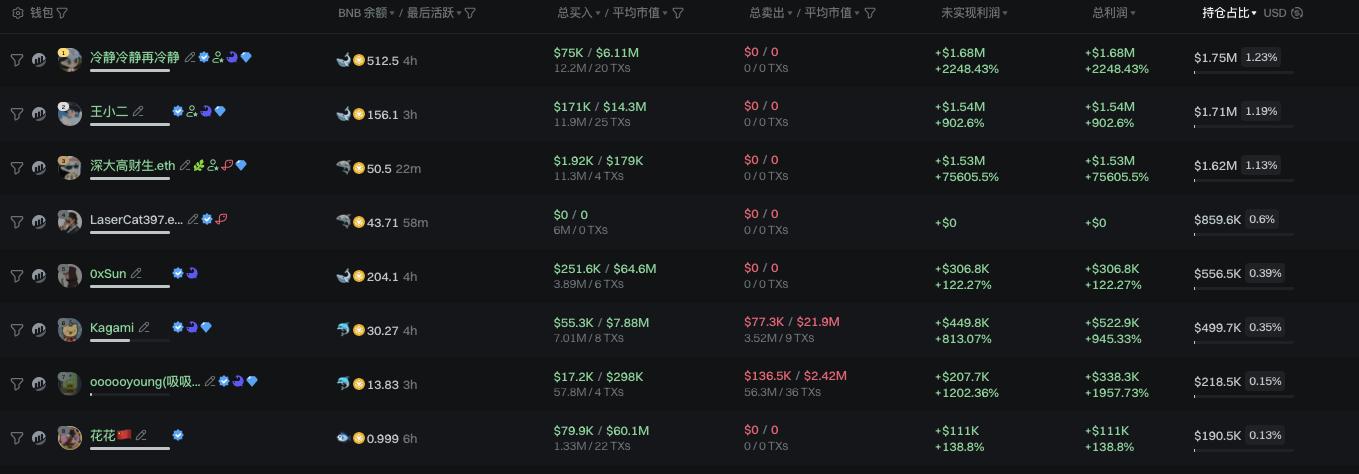 根据 GMGN 数据,冷静共买入 7.5 万美元,持仓 1.23%,目前浮盈超 165 万美元,未有卖出;王小二共买入 17.1 万美元,持仓 1.19%,目前浮盈超 154 万美元,未有卖出;深大高材生共买入 1920 美元,持仓 1.13%,目前浮盈超 153 万美元,未有卖出;0 xSun 共买入 25.16 万美元,持仓 0.39%,目前浮盈超 30 万美元,未有卖出。