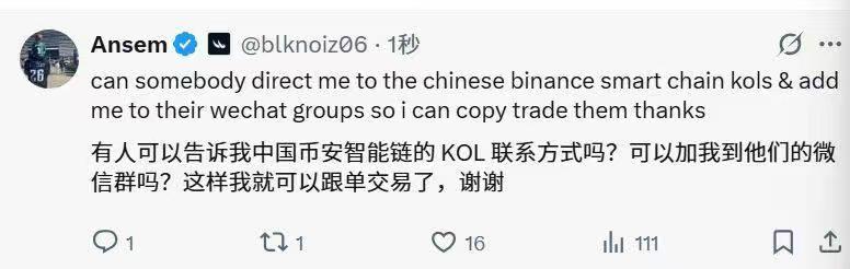“币安人生”巨大的财富效应使海外 Meme 社区垂涎若滴,纷纷想要融入中文社区,海外知名 KOL Ansem 也发帖求加入 BSC 中文社区。