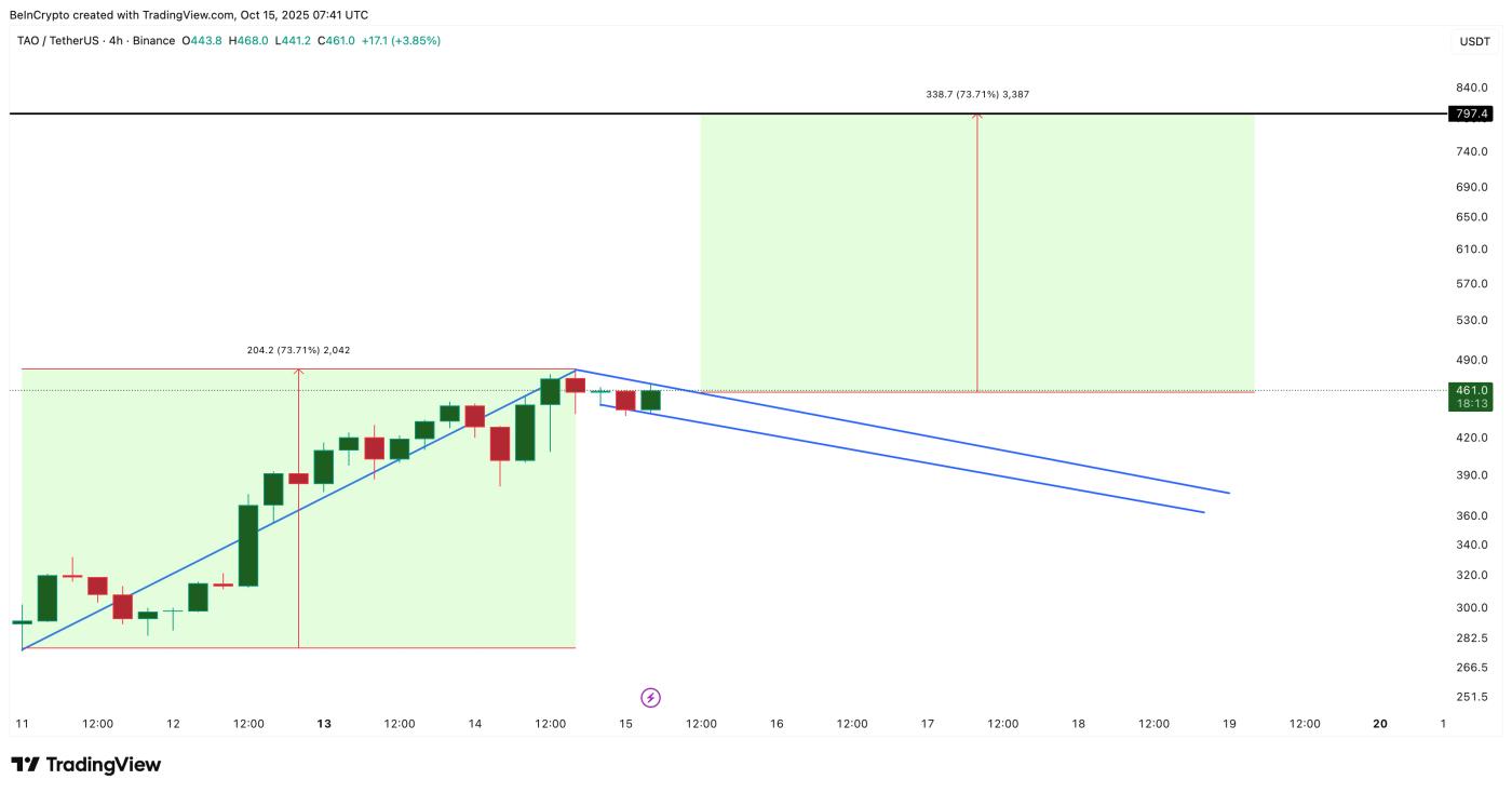 TAO 价格目前在 463镁附近交易,阻力位位于 469镁,这是该旗形形态的关键突破触发点。如果超越该形态,则预示着 73% 的上涨(如前所述),目标位包括 519镁、665镁、前期高点 757镁及更高。