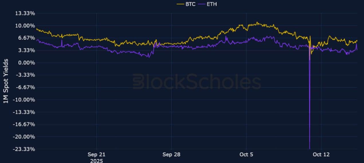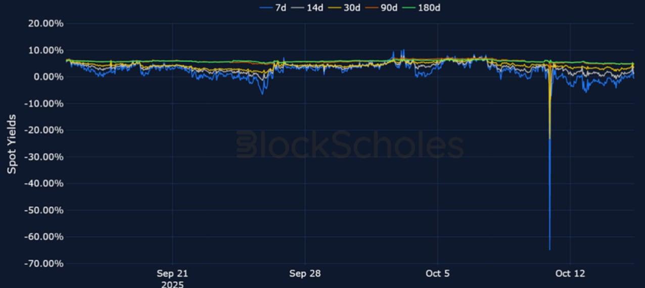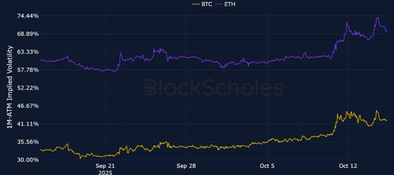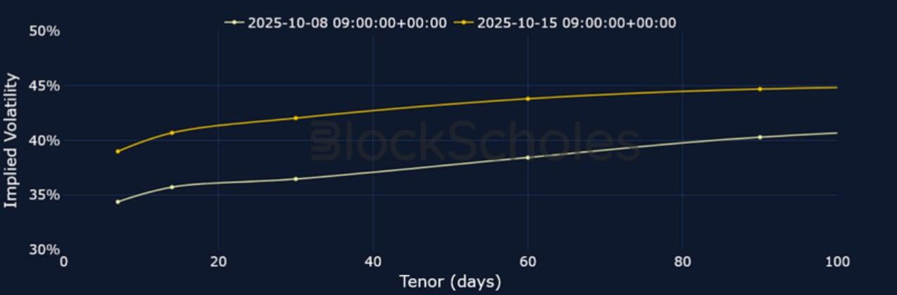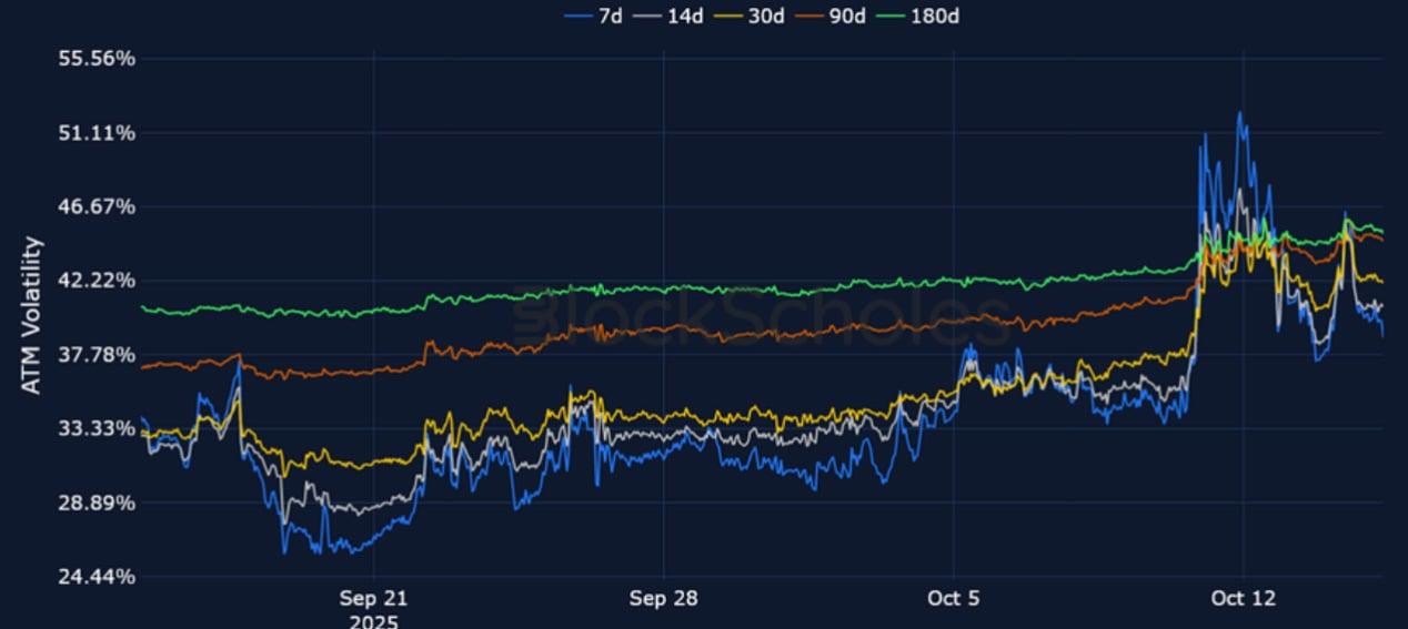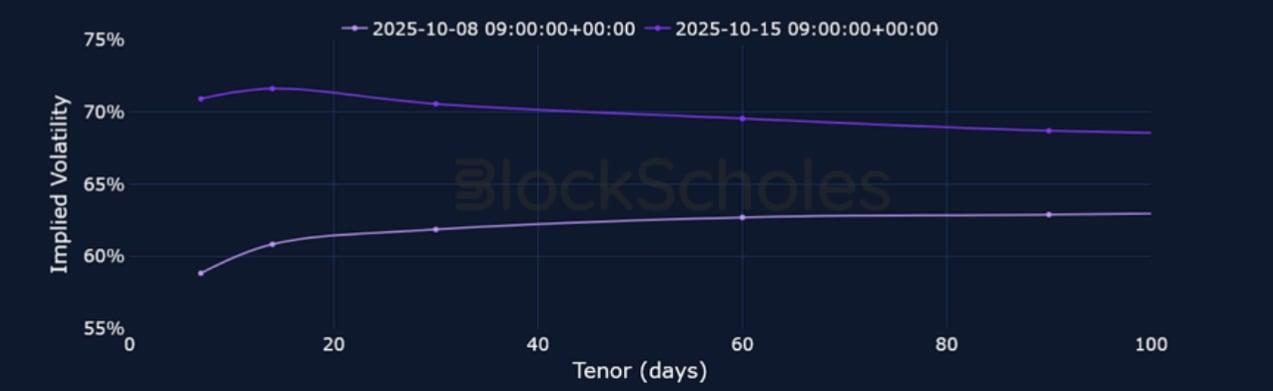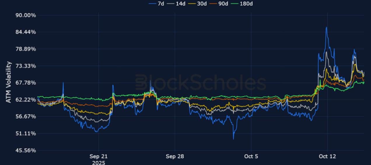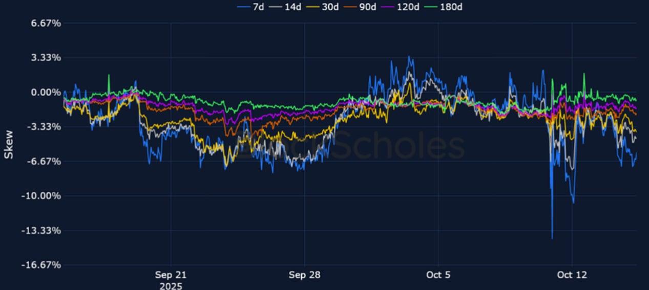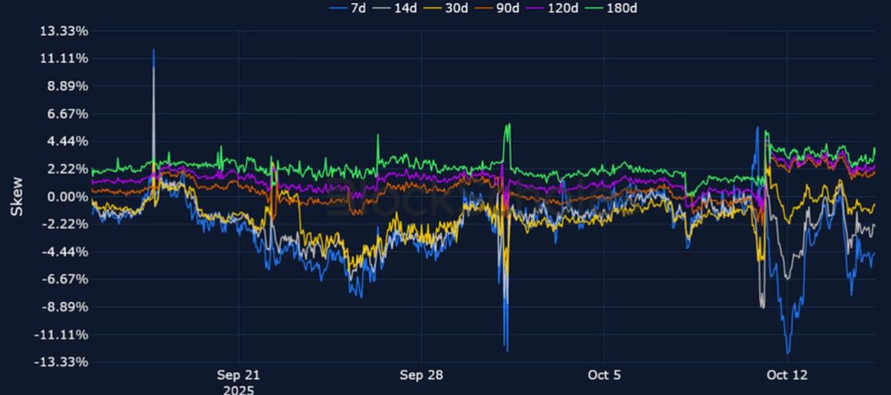 过去十天,加密资产现货市场和期权市场经历了一段动荡时期。2025 年 10 月 6 日星期一, BTC突破至 12.6 万美元的历史新高,但期权交易者仅小幅支持了这一反弹,波动率微笑略微偏向看涨期权。然而,到了星期五晚上(2025 年 10 月 10 日),随着中美针锋相对的贸易战再次升级, BTC已跌至 10.5 万美元的低点,而ETH已跌至 3,700 美元。特朗普总统宣布“对中国征收 100% 的关税,高于他们目前支付的任何关税”,以回应中国政府出台的新出口管制。仅在星期五,这笔抛售就导致价值超过 190 亿美元的头寸被清算——这是迄今为止加密历史上最大的一次。BTC 和ETH整个期限结构的 ATM 波动率水平上升,BTC 的结构经历了现在罕见的反转。在暴跌期间,波动率明显偏向看跌期权;对于BTC而言,周五的波动率处于自 8 月鲍威尔主席杰克逊霍尔讲话之前抛售以来的最低水平。