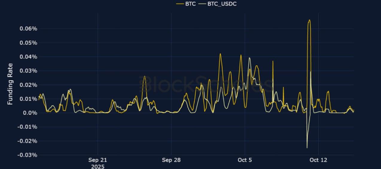 BTC融资利率BTC合约的融资利率在周五的抛售中一直保持正值,并在第二天上涨至 0.06%。