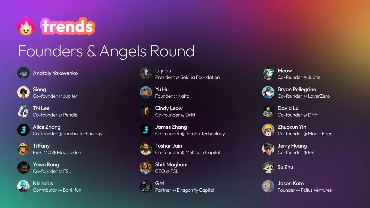 大家可能都认为,「Internet Capital Market 互联网资本市场」是当前受到 Solana 重点扶持的赛道,但 Trends.fun 做的「Information Capital Market 信息资本市场」同样得到了 Solana 的大力支持。在各类 meme 发射台陷入同质化竞争的情况下,Trends.fun 的「推文代币化」受到一众业内明星人物的支持,看看下面这份星光熠熠的投资者名单就能感受到: