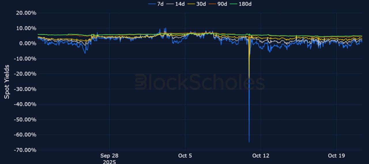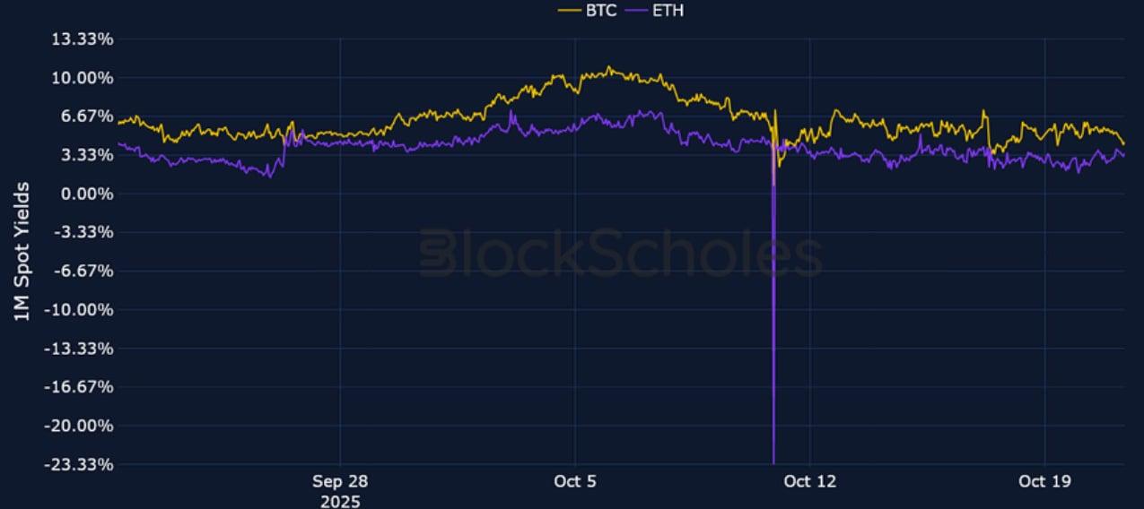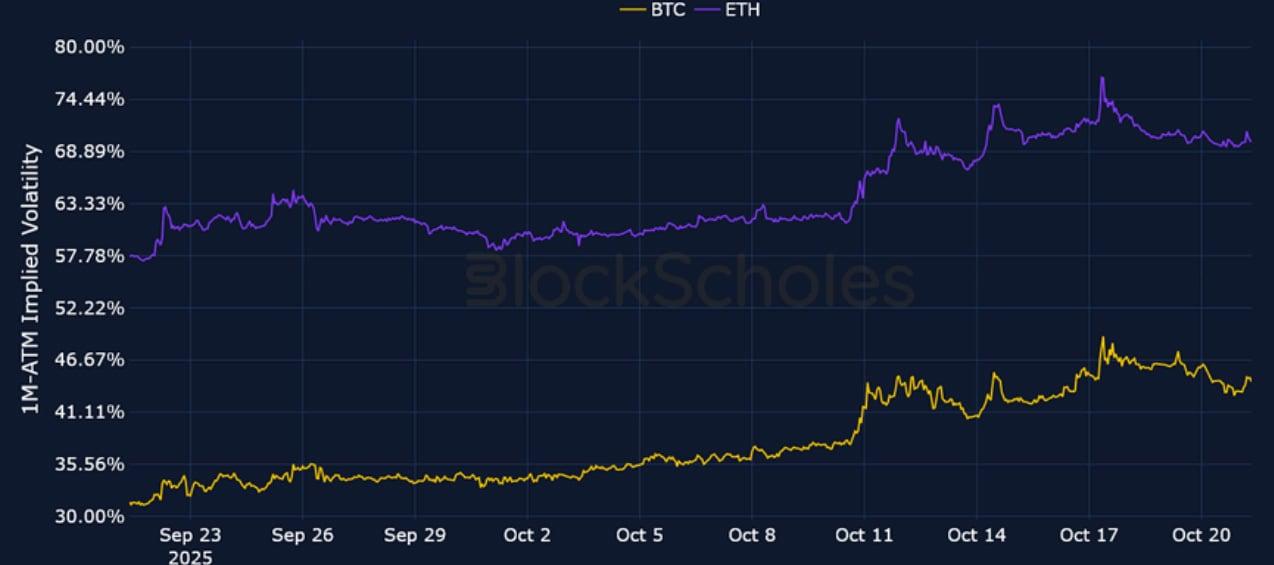 在本月早些时候 190 亿美元的杠杆仓位被撤出后,过去一周BTC和ETH分别在 10.5 万美元至 11.5 万美元和 3,700 万美元至 4,200 美元之间波动。尽管过去 7 天ETH 的表现略优于BTC ,但期权市场目前对短期ETH期权的看跌/看涨倾斜度低于类似期限的BTC期权。两种资产的 ATM 隐含波动率水平仍然较高,尽管它们的波动期限结构有所不同ETH略有倒挂,而 BTC 则趋于平缓。有趣的是,虽然加密资产价格本周略有下跌,但标准普尔 500 指数和纳斯达克 100 指数等风险偏好型美国股指在过去一周继续走高。与此同时,特朗普总统就其对华关税立场发出了喜忧参半的信号。本周早些时候,特朗普宣布美国“正在考虑终止与中国在食用油和其他贸易方面的业务”,尽管在上周五接受福克斯商业频道采访时,他声称对中国征收 155% 的关税“不可持续”。