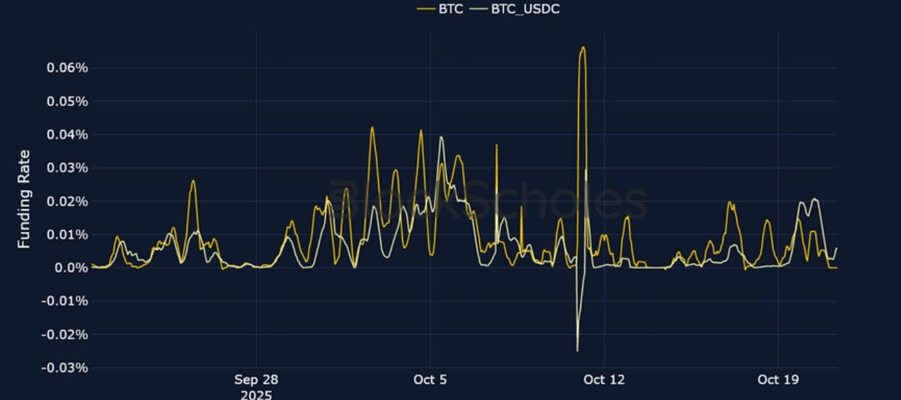 BTC融资利率——过去一周现货价格的看跌走势已通过看跌期权的倾斜反映在期权市场中,但并未反映在融资仍然为正的永续掉期合约中。