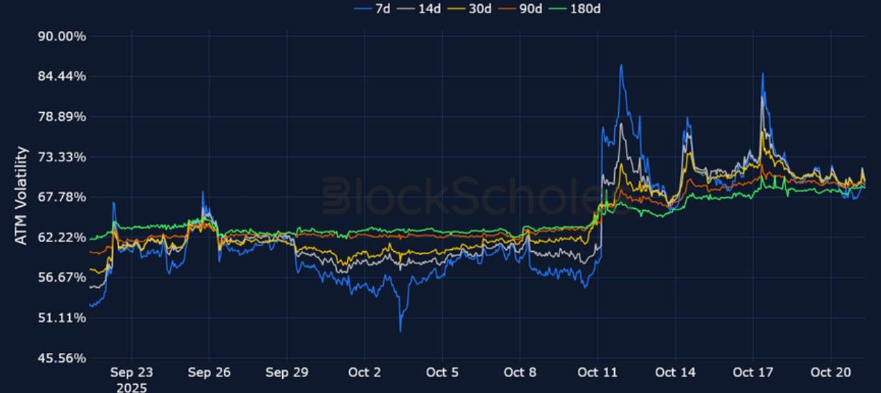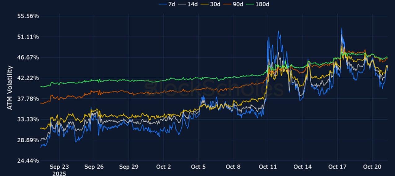 BTC SVI ATM 隐含波动率——波动率的期限结构是平坦的,IV 水平相对于 9 月底处于较高水平。