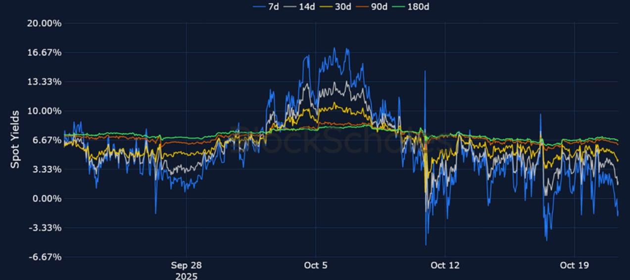 BTC期货隐含收益率——短期期货价格继续低于现货价格,这是衍生品头寸看跌情绪的迹象。