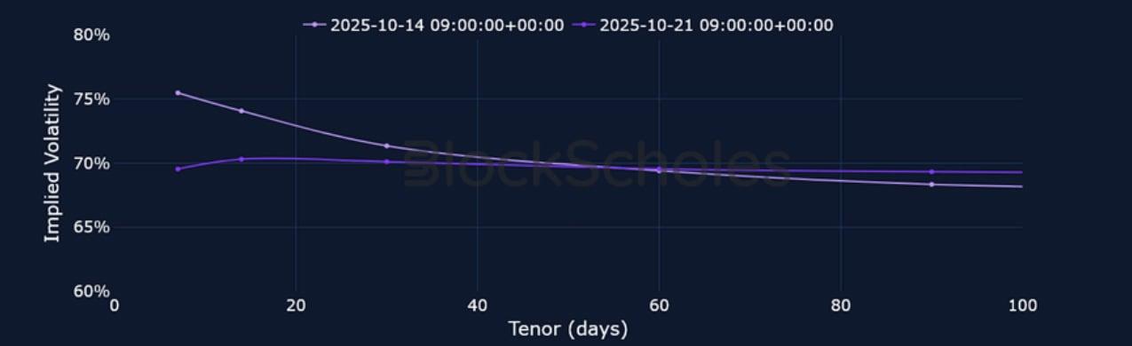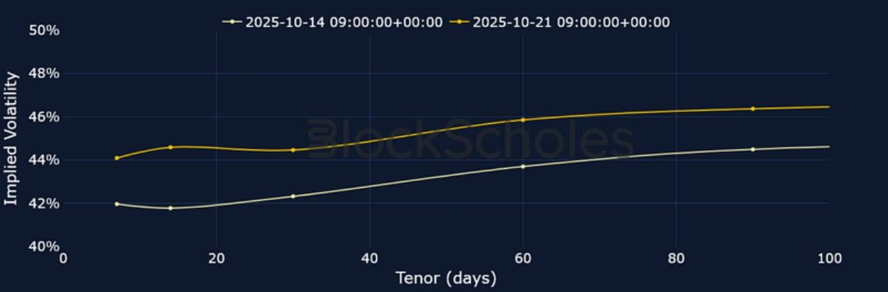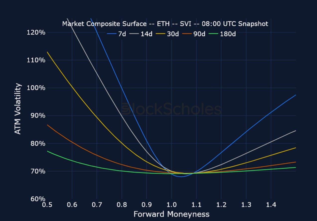 ETH SVI ATM 隐含波动率——ETH 的期限结构仍然略微倒置,与BTC的压缩曲线形成对比。