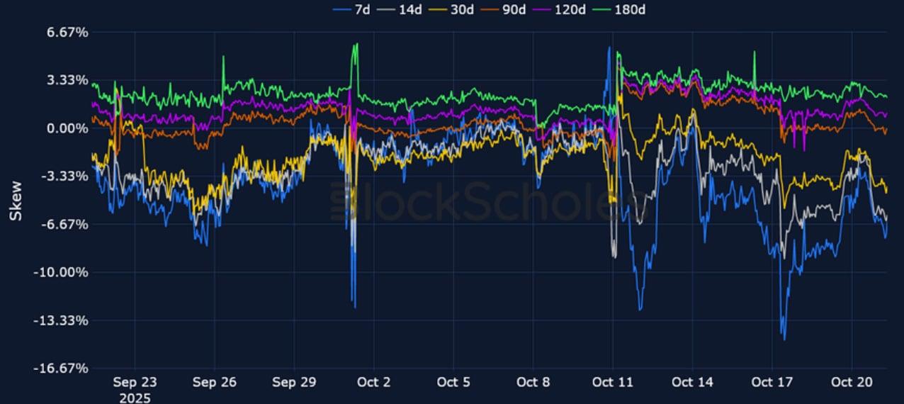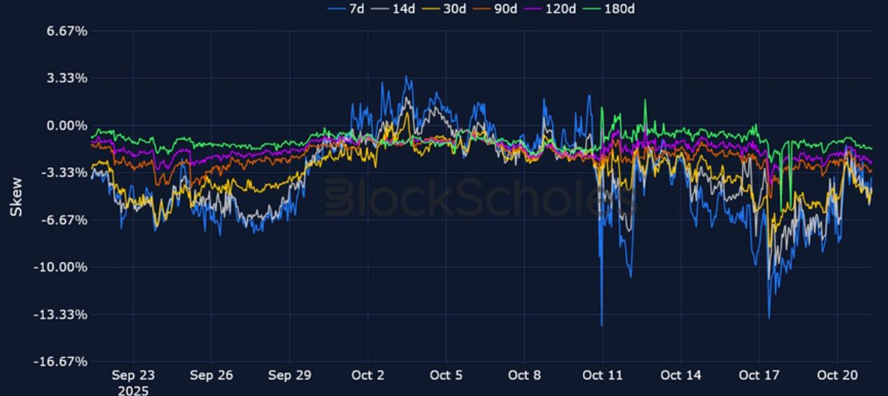 BTC 25-Delta 风险逆转——尽管自上周五以来看跌情绪有所减弱,但期权市场仍然倾向于下行保护。
