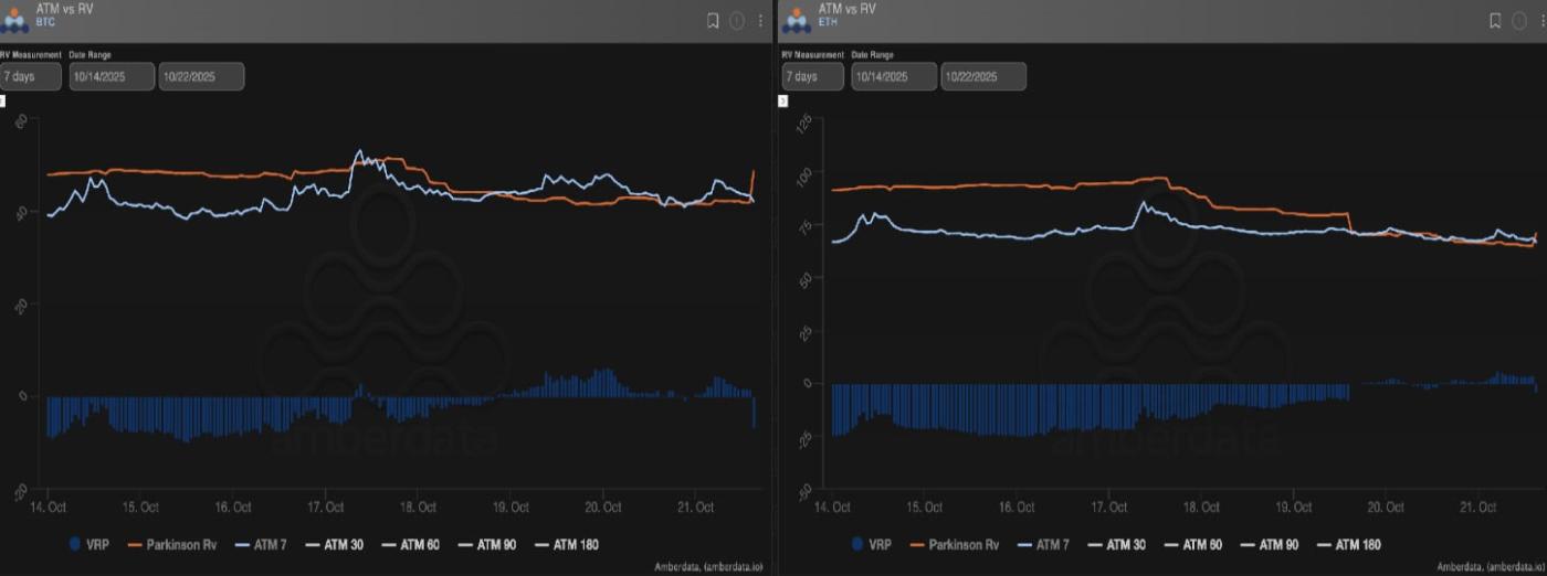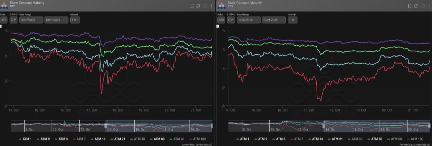 由于每周下行保护需求激增,期权倾斜期限结构在周中急剧陡化, BTC看跌期权的交易价格为13倍波动率的溢价, ETH接近15倍。此后,两者均已恢复至3-5倍波动率的适度看跌期权倾斜水平。长期BTC期权仍然倾向于看跌期权,这反映出机构投资者持续进行对冲,而非看涨信念。ETH的后端结构更为乐观,2026年到期的期权仍显示看涨期权溢价——这表明市场预期其下一轮大幅上涨将在2026年初实现。