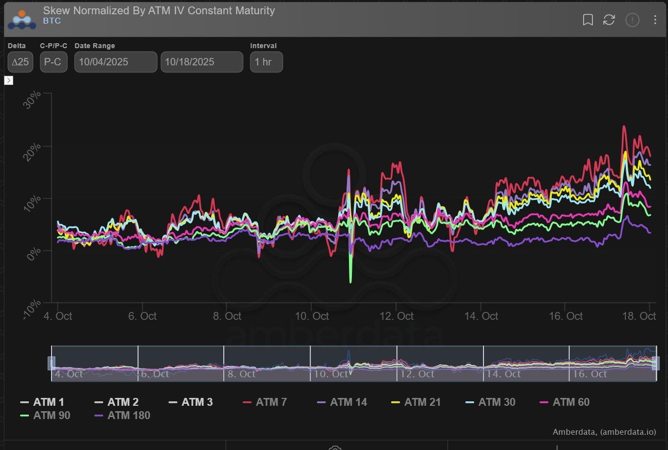 随着波动率开始稳定下来,我们看到过去几天曲线出现下降趋势,但看跌期权倾斜度仍然较高。