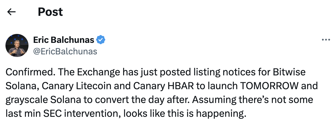 据彭博社分析师 Eric Balchunas 称,Bitwise 的Solana (SOL) ETF 以及 Canary 的Litecoin (LTC) 和Hedera (HBAR) ETF 已收到美国交易所上市通知,这些基金定于周二上线。