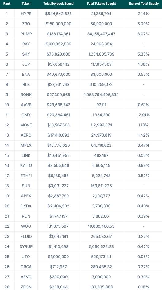 2025年采用代币回购模式的28个顶级项目。来源:CoinGecko