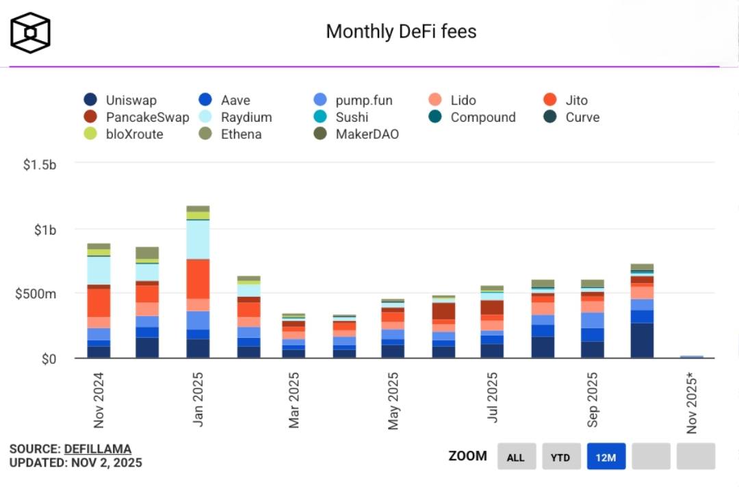 顶级 DeFi 平台的交易费收入。数据来源: The Block (2025 年 11 月 3 日)