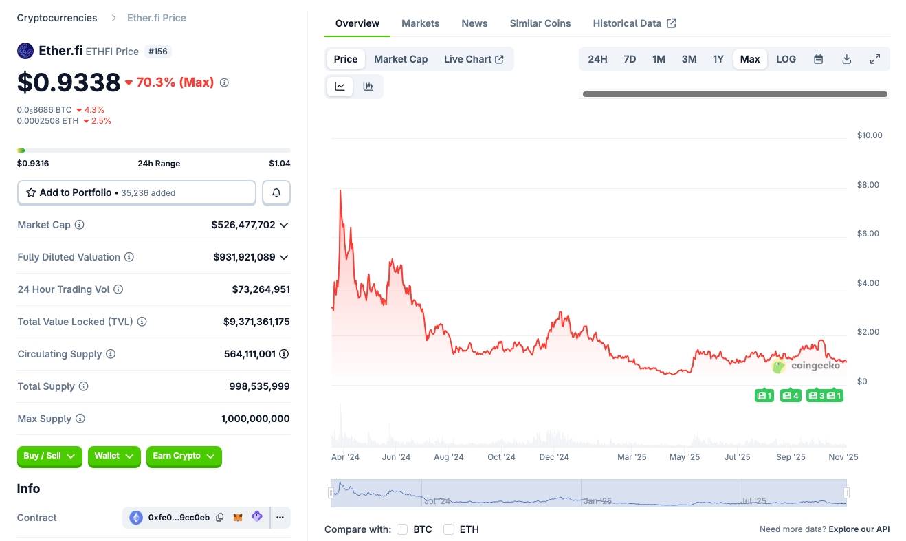 ETHFI自上市以来的价格走势,截图来自Coingecko,时间为2025年11月3日上午11:20。