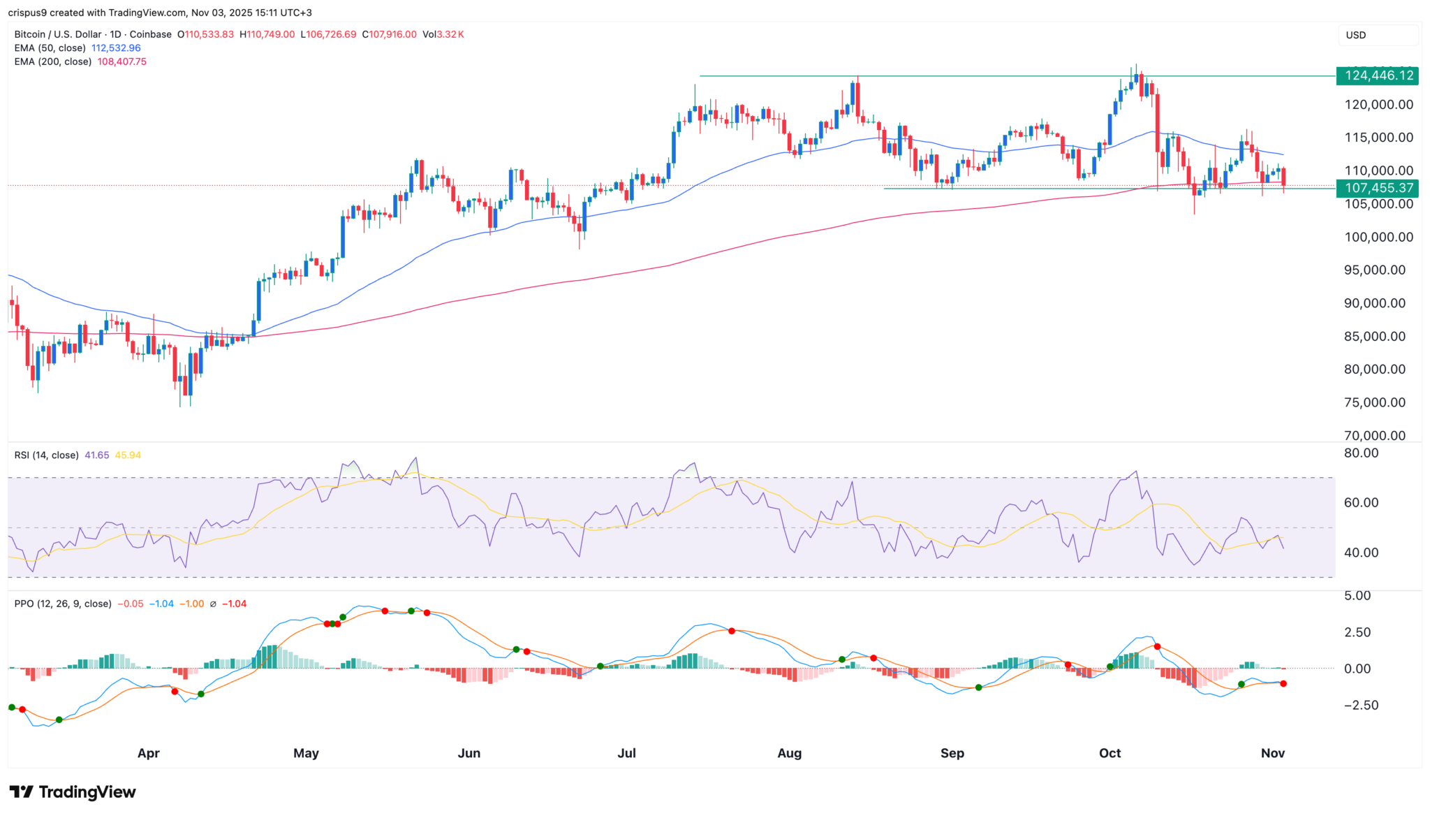 日线图显示,比特币价格在 9 月份飙升至 126,230 美元的高点,然后回落至 107,700 美元的低点。