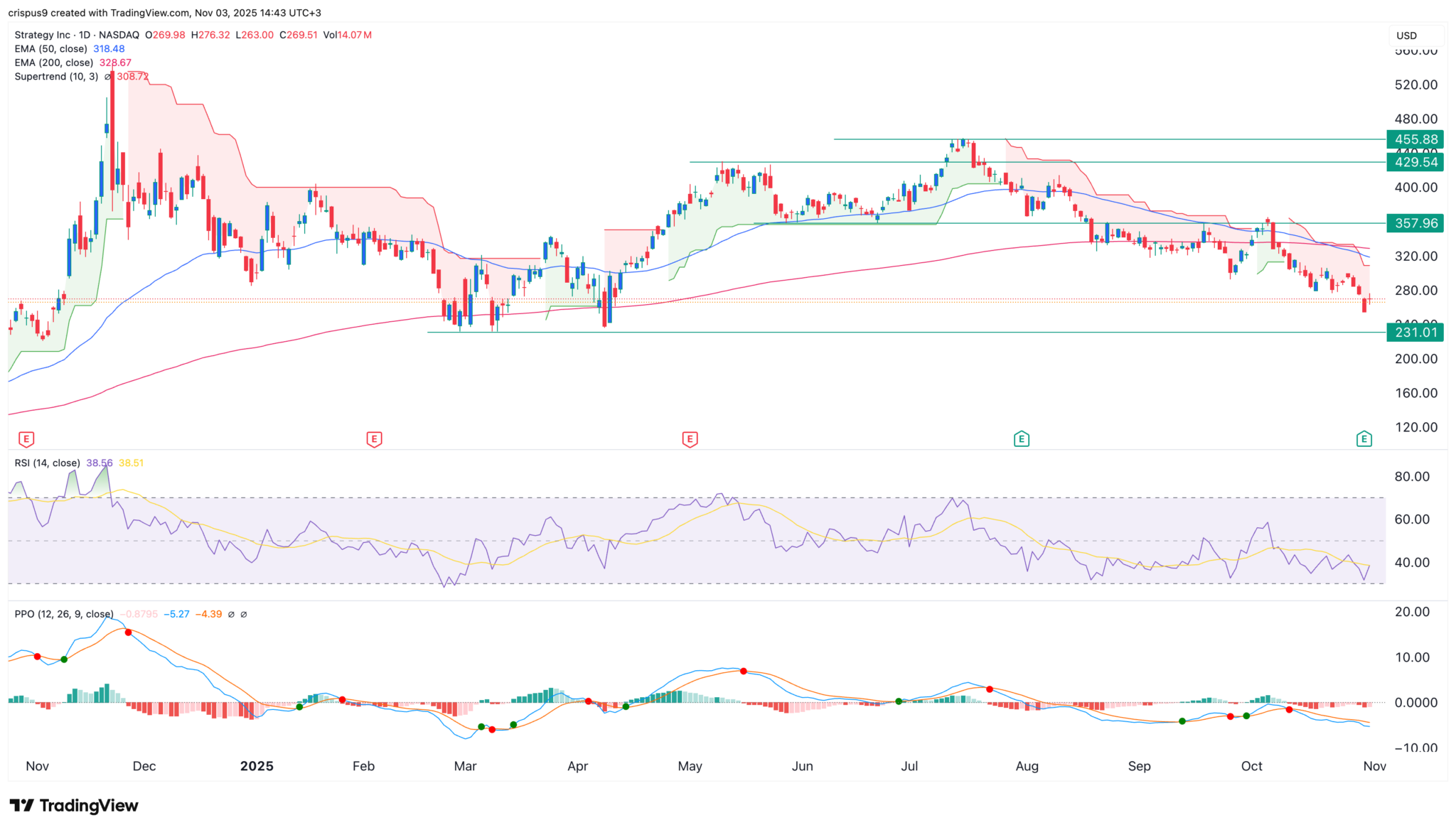 与 MSTR 股票一样,比特币价格已经跌破超级趋势指标,而相对强弱指数和百分比价格震荡指标 (PPO) 今年也持续走低。