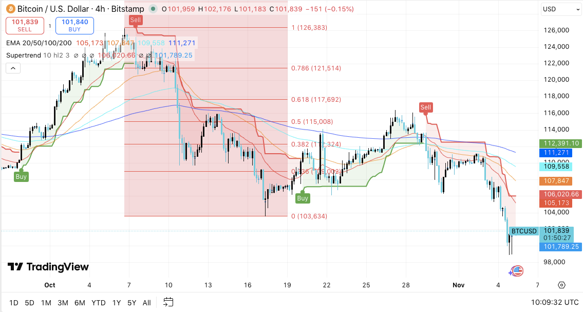 下档方面,支撑位分别位于 101,000 美元和 100,000 美元的心理关口,其后是 98,000 美元和 96,500 美元附近的更深层支撑。 4 小时图显示价格跌破所有主要指数移动平均线 (EMA),显示持续的下跌压力。超级趋势指标持续发出卖出讯号,凸显市场仍以空头部位为主导。