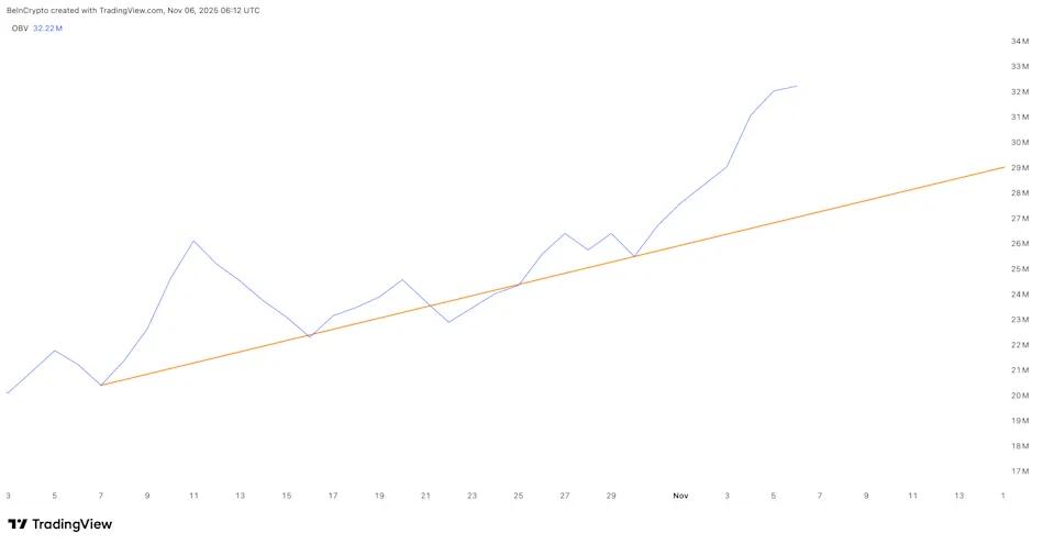 平衡成交量(OBV)指标通过将上涨日的成交量相加并减去下降日的成交量来衡量成交量累积情况。自10月初以来,OBV一直保持上涨。