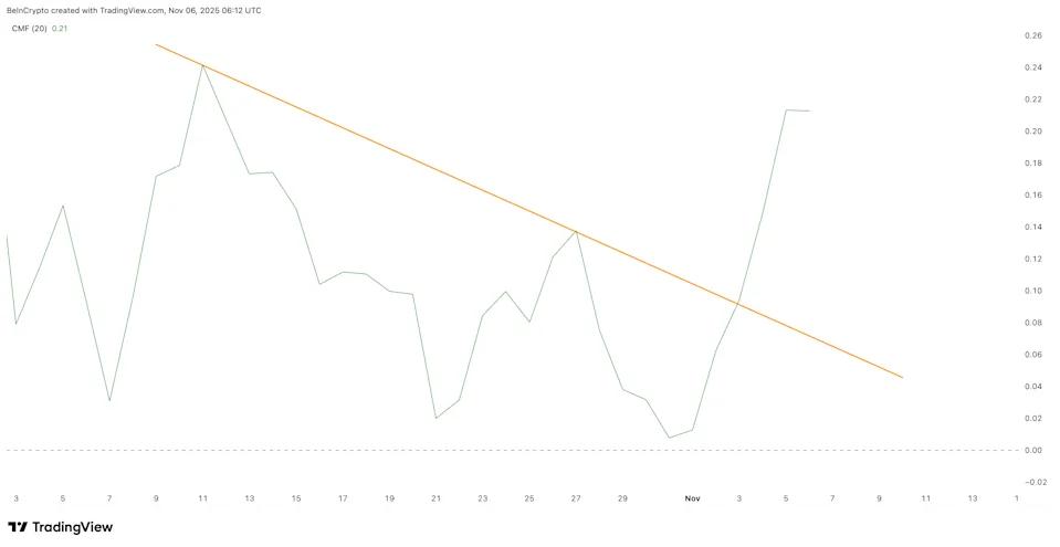 CMF 目前为 +0.21,表明资金流入强劲且高于零——这种模式通常发生在上涨持续的时候。
