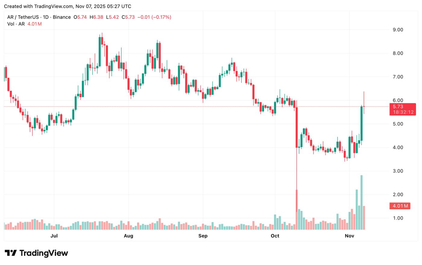 Arweave (AR)达到5.63 USDT ,同期上涨34.25% 。