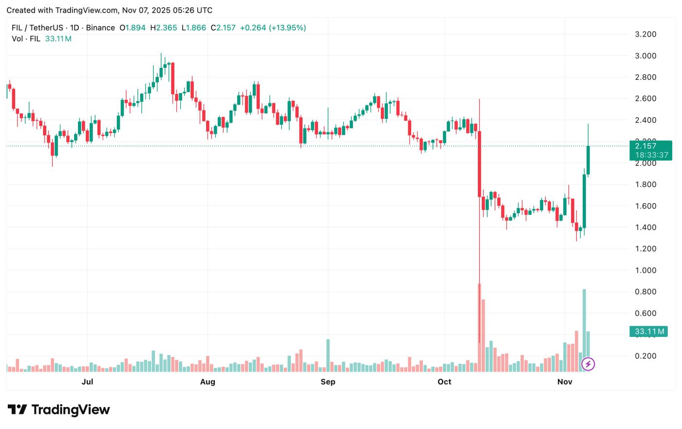 Filecoin (FIL)目前交易价格约为2.10 USDT ,在短短 24 小时内上涨了53.3% 。
