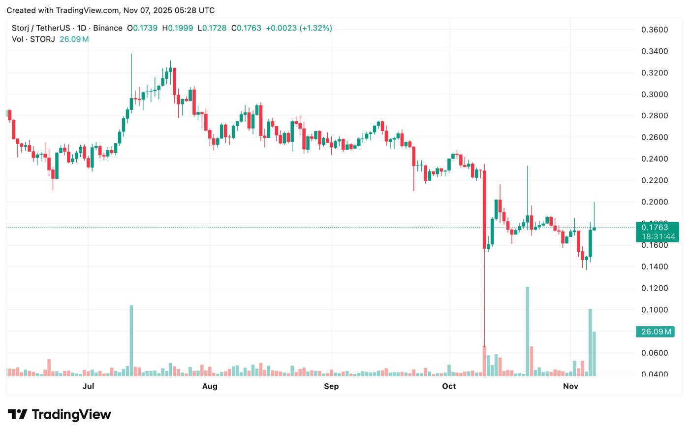 Storj (Storj)也上涨至0.18 USDT ,24 小时内涨幅达 21.02% 。