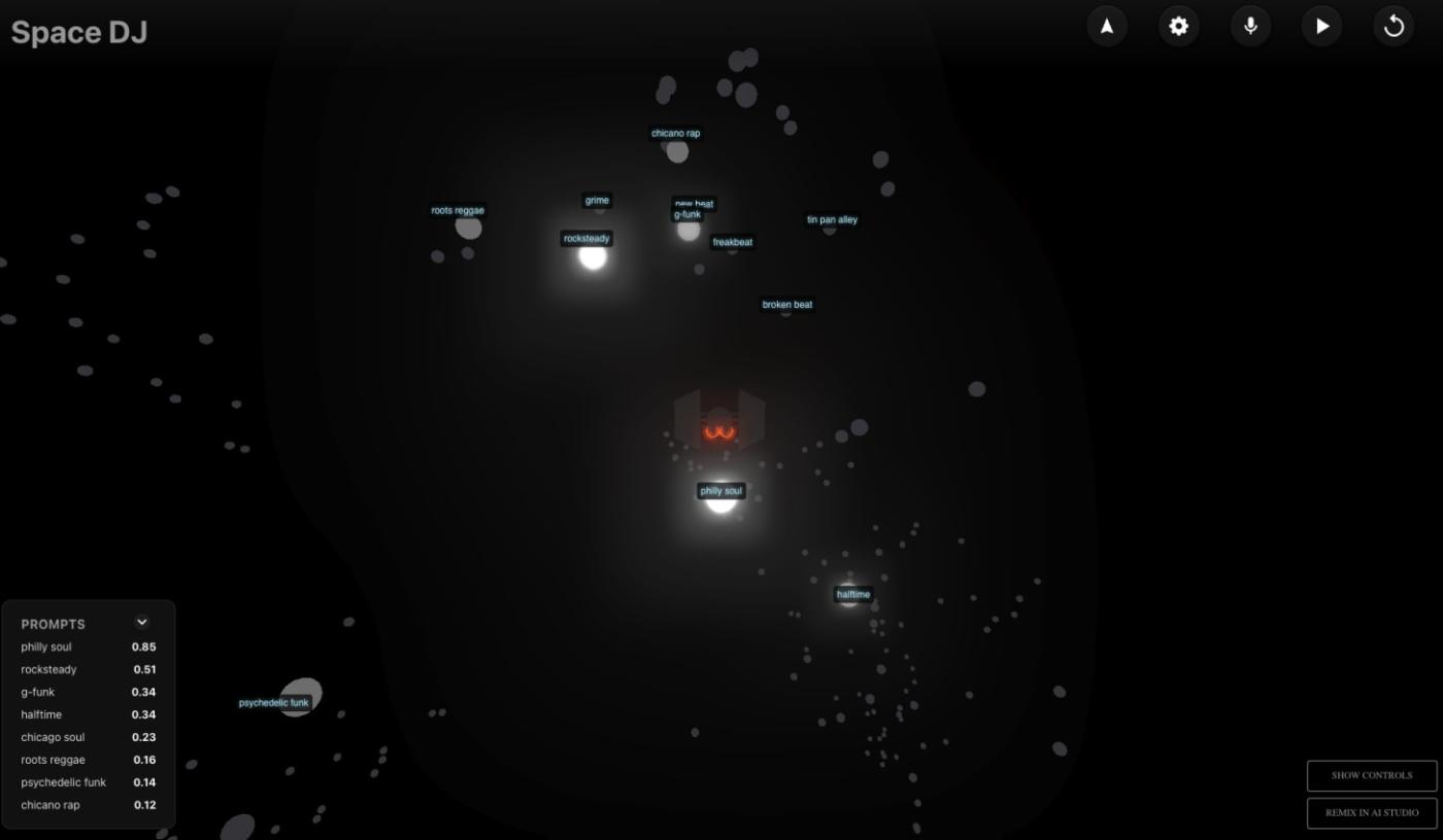 好吧好吧,再说一个跟太空有关的东西。谷歌DeepMind,也就是……唯一一家做着让我产生共鸣的、奇奇怪怪又有趣的大型人工智能实验室,发布了一款名为“太空DJ”的应用。这款应用能让你驾驶一艘小飞船,穿梭于各种不同的音乐风格之间,并生成融合这些风格的歌曲。挺好玩的, 试试吧。